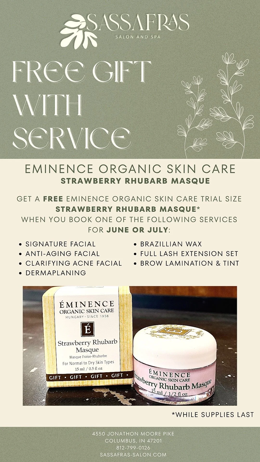 Book any of the following esthetician services in June or July and get a FREE trial-size Strawberry Rhubarb Masque by Eminence Organic Skin Care—valued at $20! 🍓💕